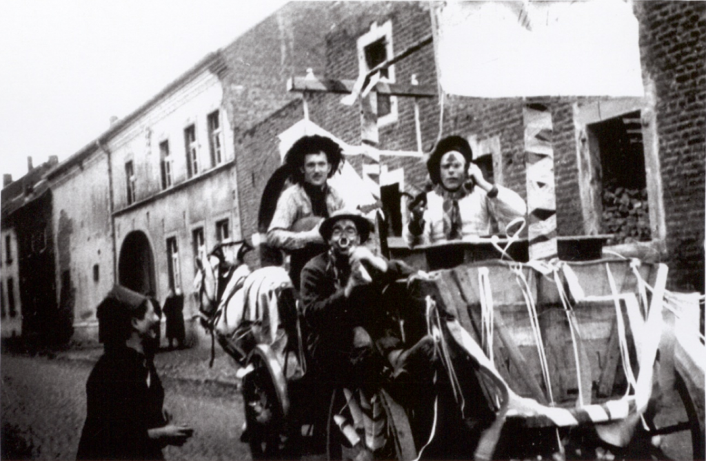 Wie auf dem Bild zu sehen ist, zog 1950 der erste Rosenmontagszug durch die Straßen Setterichs. Auf dem Wagen die „Jecken“ Hubert Schaaf und Anton Steinbusch. Vor dem Wagen von links Johannes Körver und Heinrich Gessen.