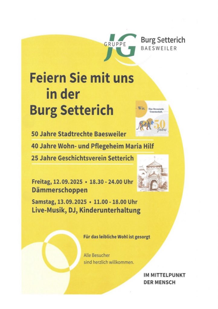 Das Jubi­lä­ums­fest wird am Frei­tag, 12.09.2025 und Sams­tag, 13.09.25 im Innen­hof und den Räum­lich­kei­ten des Wohn- und Pfle­ge­heims „Maria Hilf“ Burg Set­te­rich, An der Burg 1, statt­fin­den.